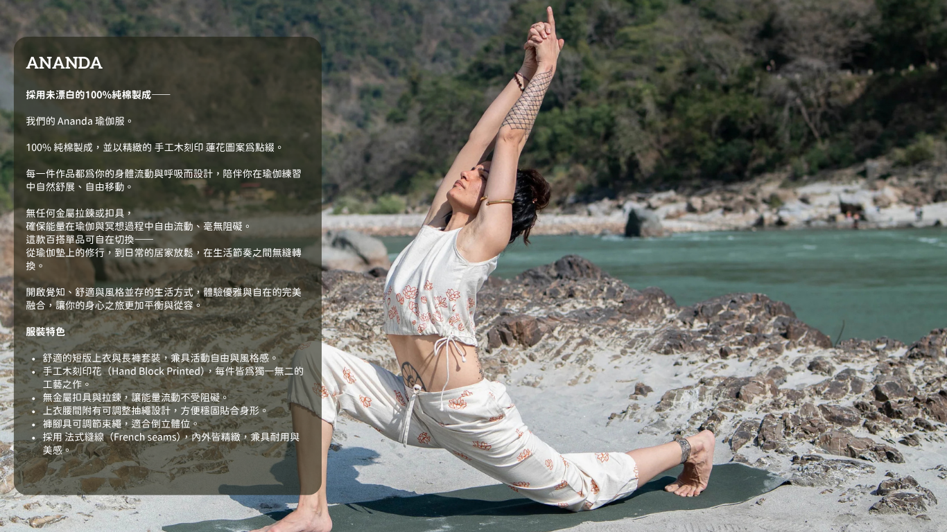 所有服裝皆以 天然材質製作,並經手工製作與/或手工印染